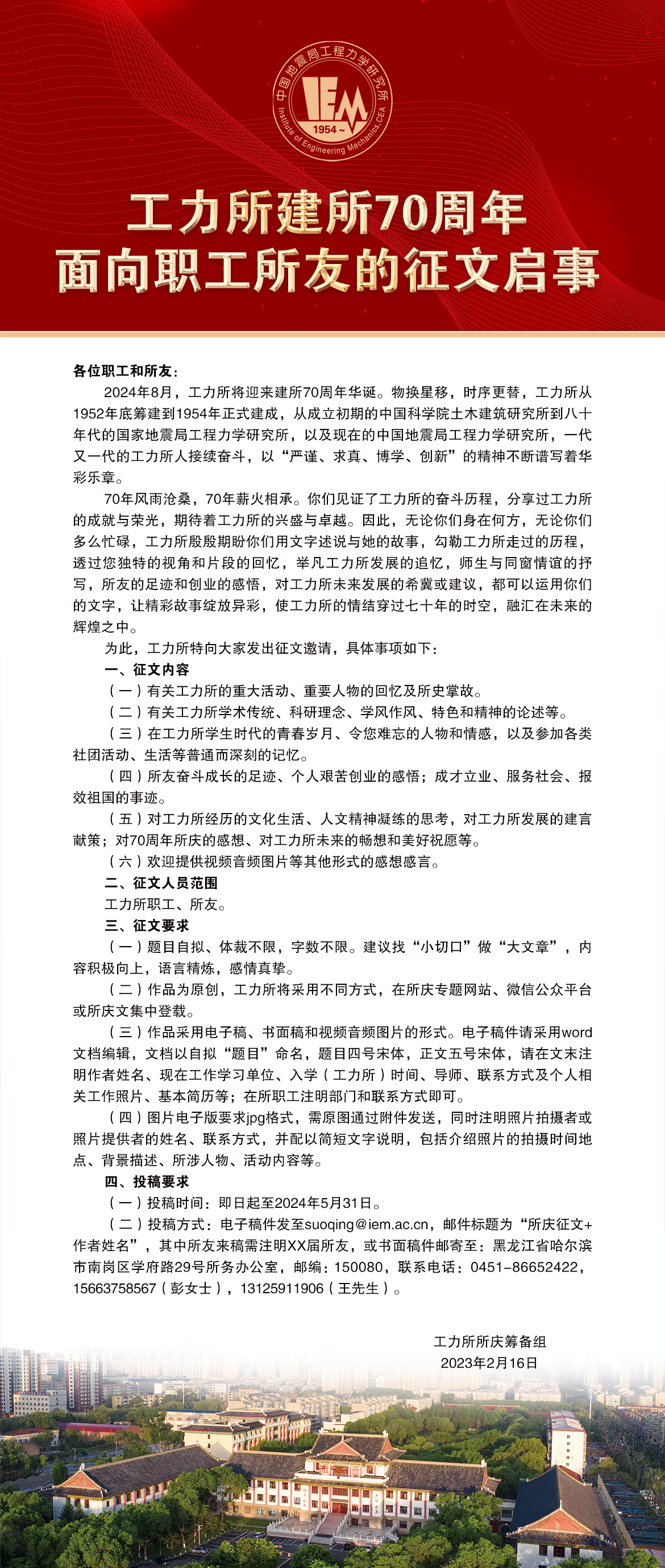 工力所建所70周年面向職工所友的征文啟事