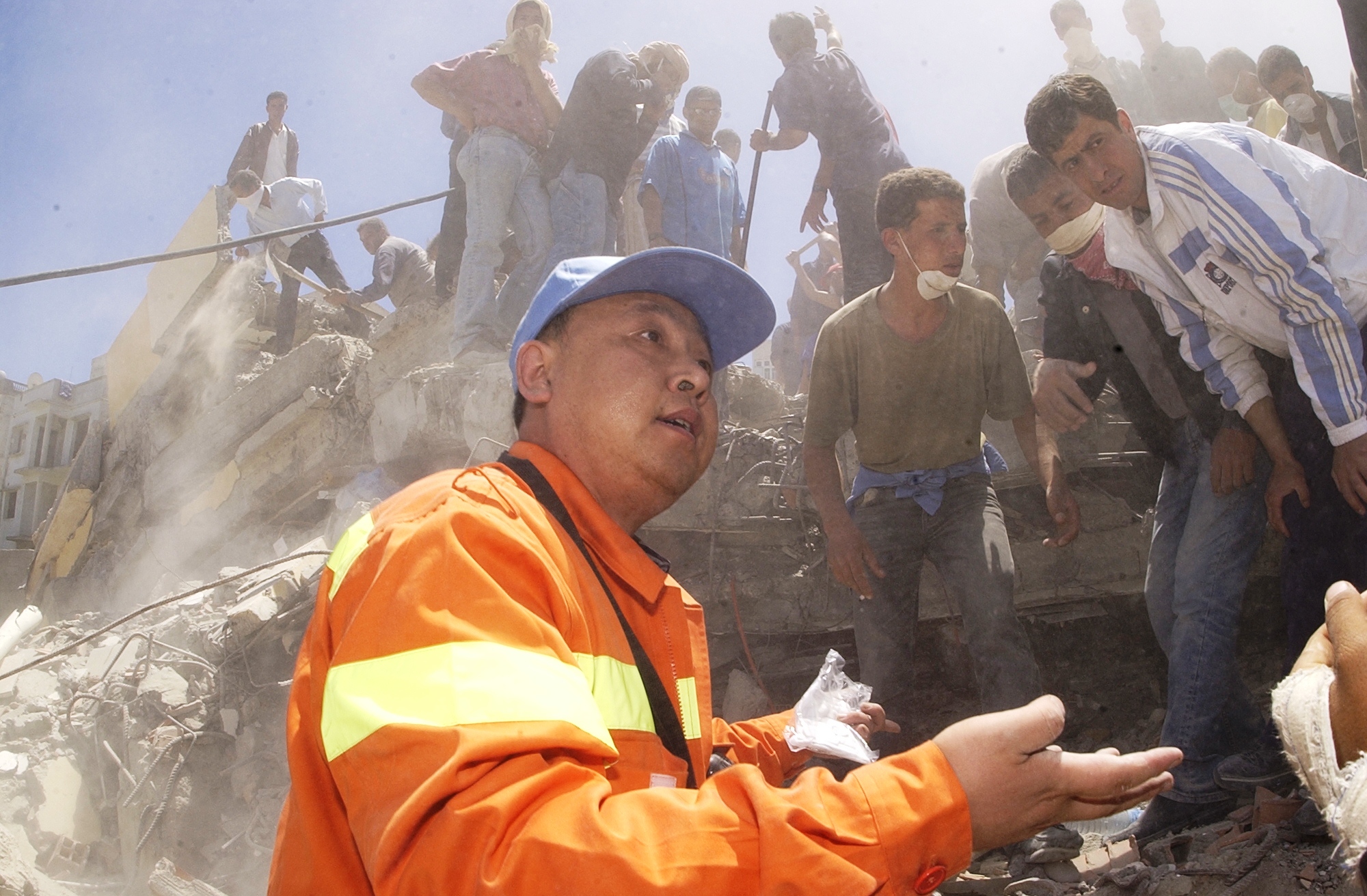 發布時間: 2023-08-02 點擊數量:6660走進位于哈爾濱市南崗區的中國地震局工程力學研究所(簡稱“工力所”),文化墻上的一幅照片格外引人注目:震后的斷壁殘垣間,深膚色卷頭發的救援人員圍住一位中國專家,他身穿橘黃色國際救援隊服,正全神貫注地講解著。這是工力所二級研究員、博士生導師孫柏濤,作為中國國際救援隊專家參與指導2003年阿爾及利亞地震現場救援的場景。