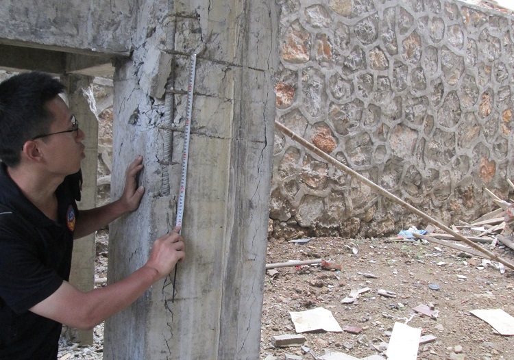 用尺子測量鋼筋混凝土結構構件破壞位置的鋼筋直徑、間距和混凝土保護層厚度、裂縫寬度,測量房屋的樓層變形,拍照留存……林旭川和科研人員們對每一處破損的房屋都不放過,以獲取量化的結構參數與破壞特征參數。