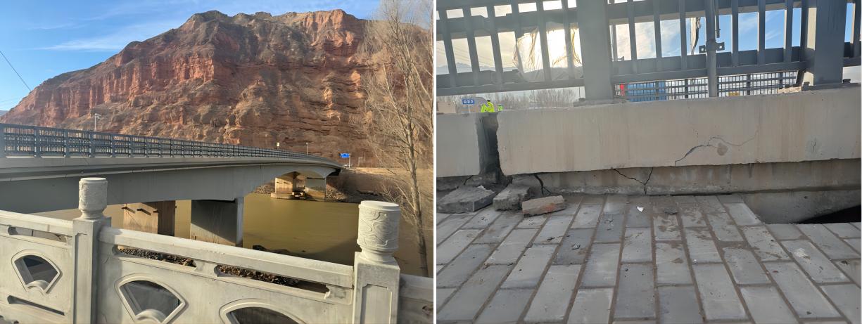 調(diào)查簡述:大河家黃河大橋舊橋為鋼構(gòu)橋,橋梁主體橋墩、梁未發(fā)現(xiàn)明顯裂縫,在兩端橋臺發(fā)生嚴(yán)重破壞,梁端擋快由于碰撞發(fā)生沿?fù)蹩斓男绷芽p;橋面局部護(hù)欄發(fā)生較大尺寸外閃;大河家黃河大橋新橋為連續(xù)梁橋,橋梁主體橋墩未發(fā)現(xiàn)明顯裂縫,梁體在甘肅側(cè)橋臺處發(fā)生碰撞,局部梁體產(chǎn)生可見裂縫,伸縮縫處縫隙加大,且向青海側(cè)滑移3cm左右;橋梁青海一側(cè)橋臺發(fā)生嚴(yán)重裂縫,裂縫寬度5cm左右。梁體有逆時針轉(zhuǎn)動傾向。在大河家黃河大橋旁邊的廣場有一個簡支梁公路橋,該橋主體完好,在橋臺處欄桿有外閃,以及橋面與路面的撞擊裂縫。