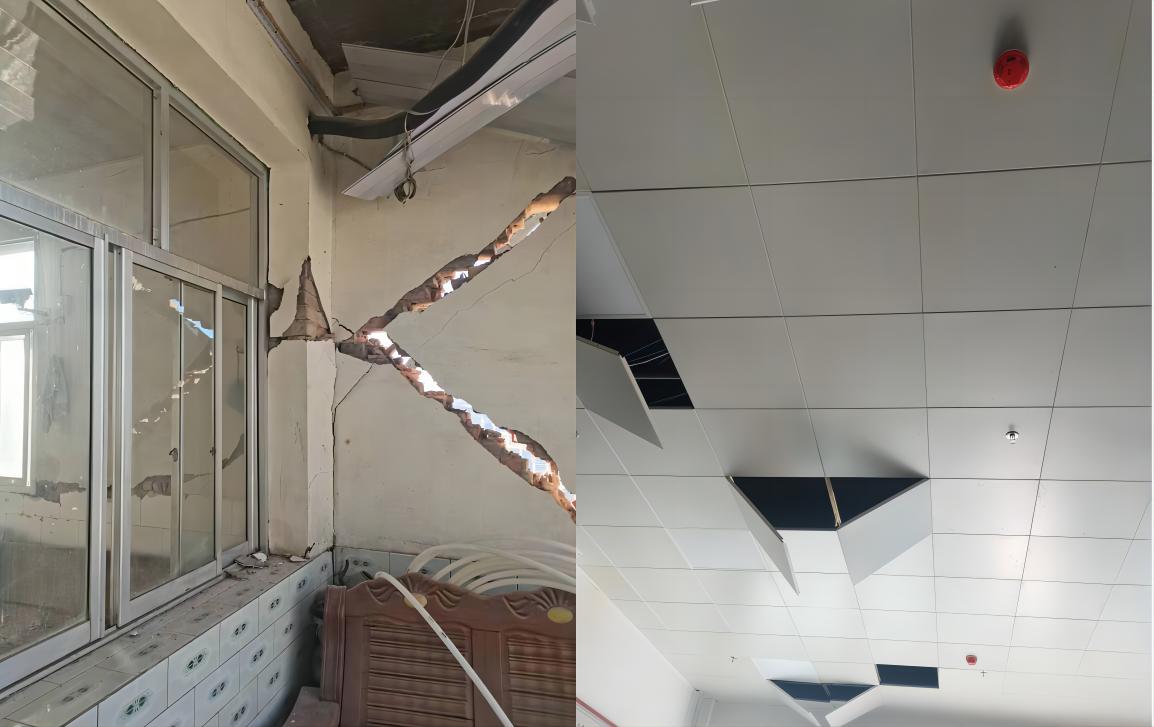 1.調(diào)查大河家中學(xué)教學(xué)樓、實驗樓、食堂和學(xué)生宿舍的震害情況。其中,4個結(jié)構(gòu)的結(jié)構(gòu)構(gòu)件均無明顯破壞,非結(jié)構(gòu)構(gòu)件砌體填充墻、吊頂破壞嚴(yán)重。雖無倒塌風(fēng)險,但使建筑的使用功能中斷。