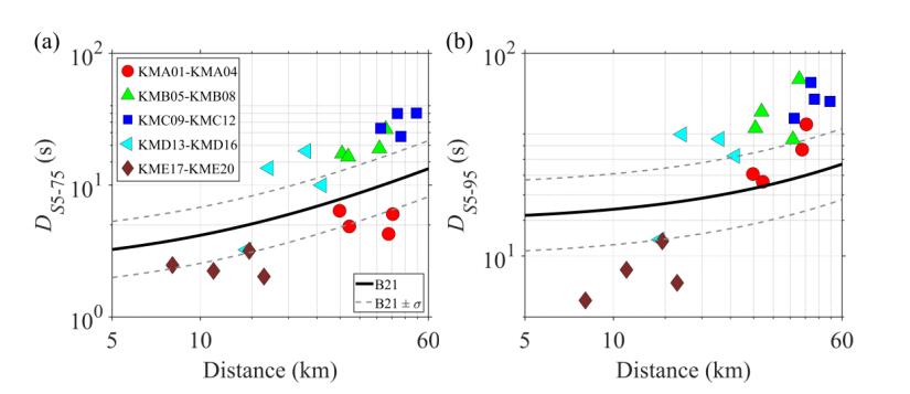 圖2 2016年Mw6.0 Off-Mie地震的顯著持時(shí)與陸域GMPEs的比較:(a) DS5-75和(b) DS5-95