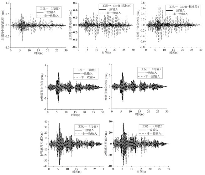 地震動(dòng)的頻域非平穩(wěn)性可通過累積穿零量隨時(shí)間變化進(jìn)行描述,在傳統(tǒng)譜表達(dá)合成地震動(dòng)的基礎(chǔ)上分別引入相位差譜和累積穿零量對(duì)合成結(jié)果進(jìn)行強(qiáng)度、頻域非平穩(wěn)化。利用CESMD數(shù)據(jù)庫中豐富的地震動(dòng)記錄擬合出相位差譜隨震級(jí)、震中距變化模型,以及累積穿零量隨時(shí)間變化的經(jīng)驗(yàn)?zāi)P停俅肟臻g相干函數(shù)拓展為多點(diǎn)非平穩(wěn)地震動(dòng),改進(jìn)后方法流程如圖1。由圖2可知,所模擬的地震動(dòng)時(shí)程不僅具有強(qiáng)度及頻域非平穩(wěn)性,同時(shí)體現(xiàn)了空間多點(diǎn)的相干性。將上述合成的地震動(dòng)通過一大跨橋梁進(jìn)行多點(diǎn)地震動(dòng)輸入驗(yàn)證,討論了一致和非一致輸入下的結(jié)構(gòu)響應(yīng)差異。