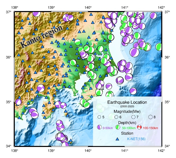 圖1 所選K-NET強震臺站和地震震源分布