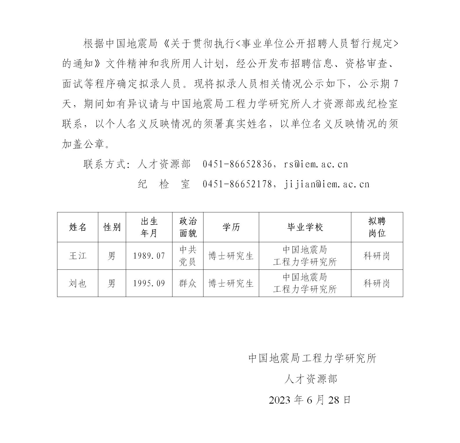 中國地震局工程力學研究所2023年擬錄用人員公示(二)